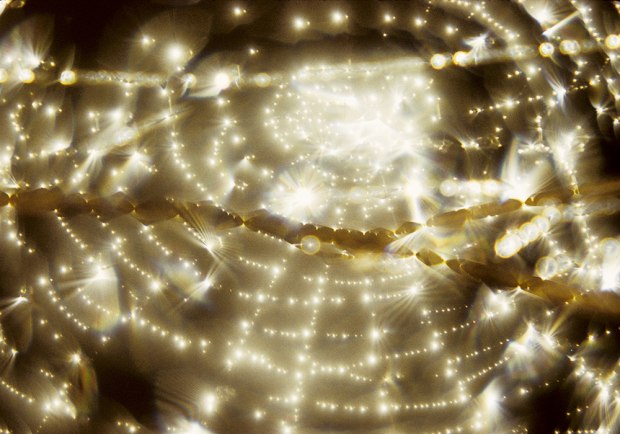 In the inner world of the spider's web, where sunlight diffracts and wide-open 50mm f/1.2 Nikkor (mounted in reverse) allows the smallest possible depth of field, the out-of-focus artifacts fade away to become fairy lights or stars, seeming very close or very far far away.