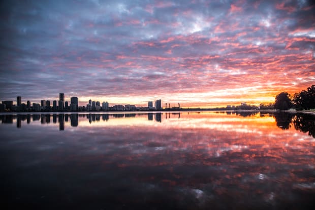 Captured one Saturday morning on my way to work. Shows the city of Perth reflecting on the Swan river with the sun rising