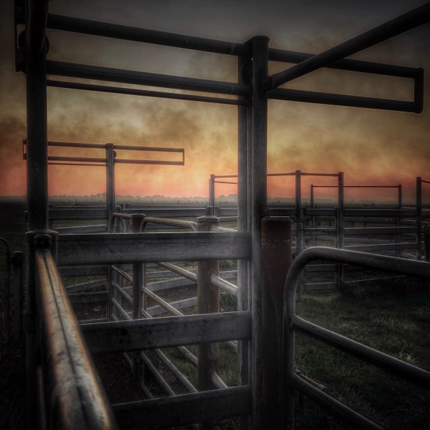 Cattle yards at sunset, made all the redder due to the smoke from distant bushfires.