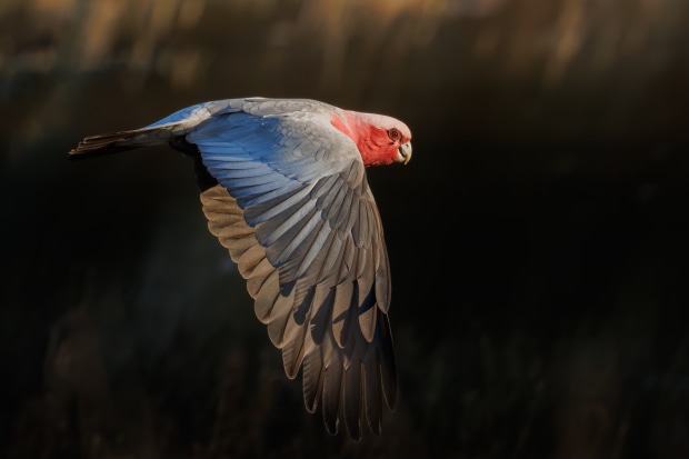 A galah flies over the samphire and into the sunset at Alfred Cove.