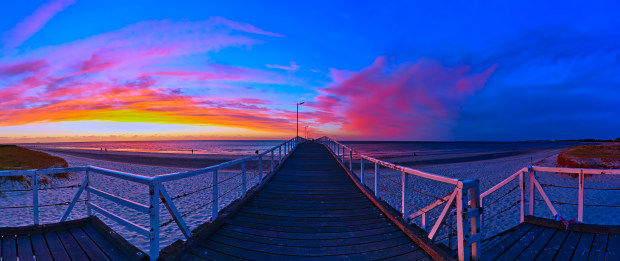 Sunset at Largs Bay Jetty (Sony A6000 1/60s f/4.0 16mm (24mm eq) ISO 160 - 6 pictures stitched with Hugin, post processed in Darktable)