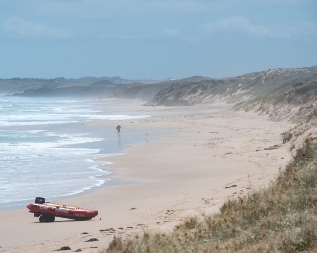 A summer day at the surf beach at Cape Woolamai in Phillip Island. It was a soft pastel palette which made the bright red lifesaving boat stand out. I love the surfer casually strolling through the shot as well.