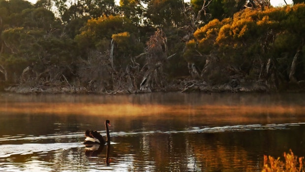 Black Swans in morning mist on Manning Lake, Fremantle, WA