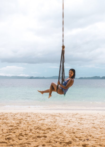 My beautiful wife at our honeymoon couldn't help herself with this swing on the beach in El Nido, Palawan. I couldn't help but take a photo and it turned out amazing!
