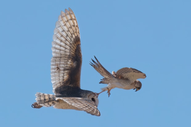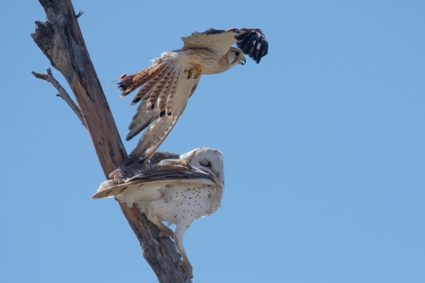 An Eastern Barn Owl and Nankeen Kestrel playing aerial tag. The owl won, and found shelter in a nearby hay shed.