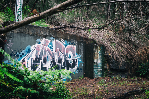 You can pour concrete. You can rivet steel. You can bulldoze. But Mother Nature will always win. These structures, in various national parks and along the coastline of Sydney, are losing a battle against the encroaching green tide. And, it seems, the graffiti artists are getting in quick before it engulfs them.