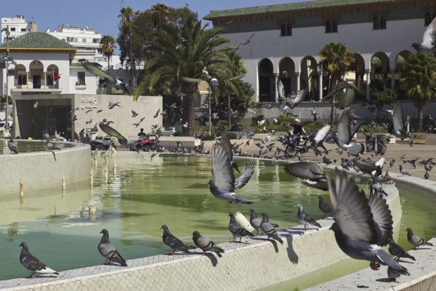 Pigeons taking flight at Mohammed V Square in Casablanca.