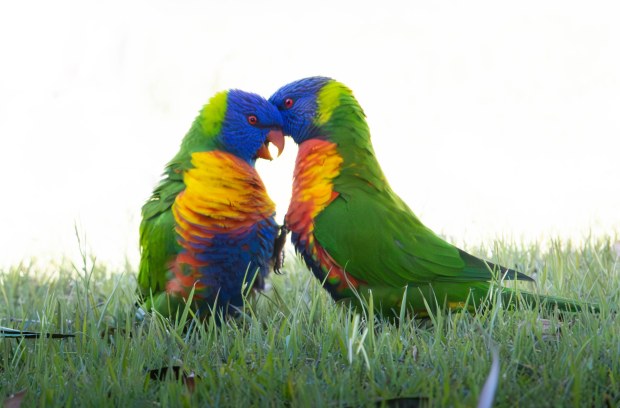 Two lorikeets clash with colours colliding in a flash of wild energy.