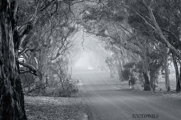 Foggy morning on the country road as a car appears from the distance.