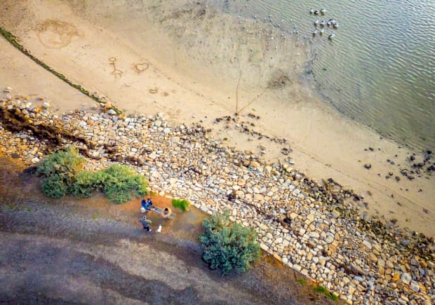St. Kilda beach, South Australia. Where friends meet to watch the sunset and walk their dog. Where birds flock, to feed and rest. Where children create art in the sand. Kite Aerial Photography image.