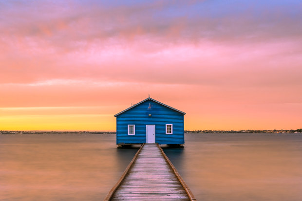 Crawley Edge Boatshed, also known as the Blue Boat House, on the Swan River in Perth. Captured on a winter morning with a stunning sunrise.