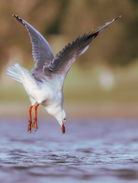 A majestic seagull plunges gracefully into the water, wings tucked, eyes locked on its prey, capturing the raw precision of nature’s hunt.