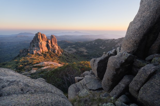 Morning light shines on The Cathedral - a dramatic granite tor atop Mount Buffalo.