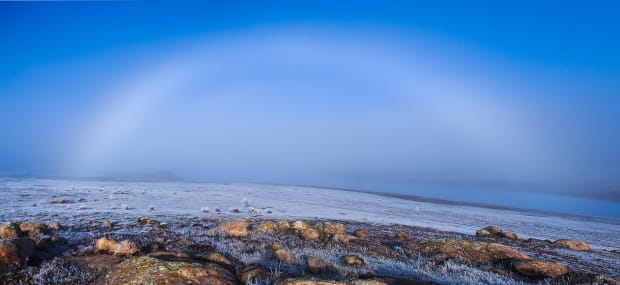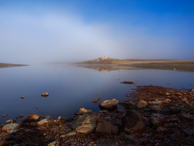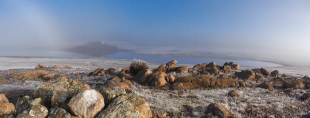 The Causeway -Tantagara Dam -Kosciouszko National Park NSW on a cold frosty morning under a fog bow