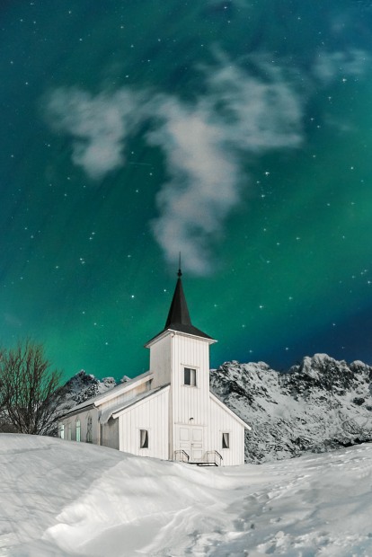 We tramped through thigh high snow to reach this pretty church as theaurora, shooting and sparkling stars, and a little cloud lit up the night in Sidpollnes, Norway.