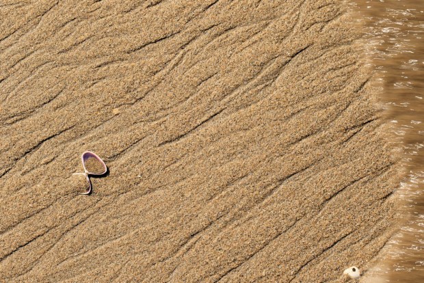 Patterns of the sand, a lone shell and an incoming wave; at Seven Mile Beach in NSW.