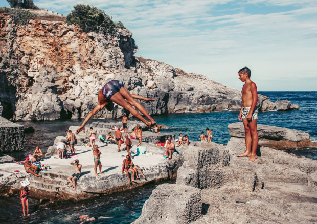 I love the beauty of this moment - the extraordinary diver takes flight as the young boy watches in awe. I noticed the diver jumping from the rocks and scrambled up to capture a few frames. As soon as the boy walked in, I knew I'd captured a special moment - the magic of human flight.