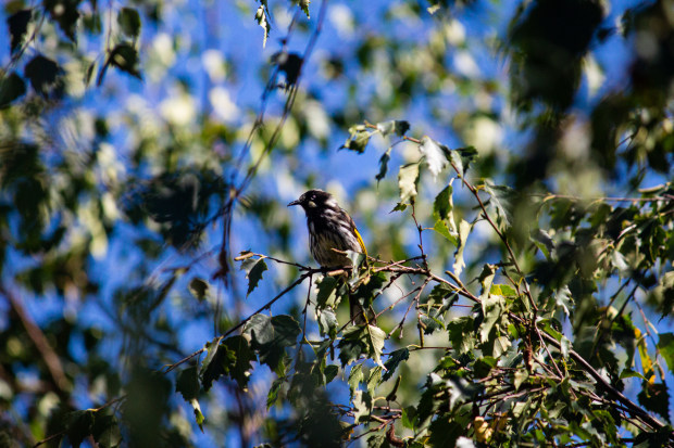 A curious New Holland honeyeater who has made it a habit to join me in my garden for afternoon reading. It sits within the birch branches and keeps me company.