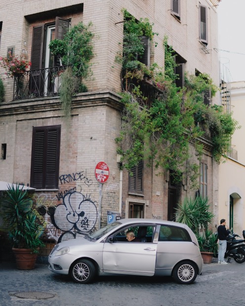 Taken on the streets of Rome in the late afternoon. This photo is almost a metaphor that captures the essence of Roman Streets - cobblestones, an inconveniently pared hatchback with multiple dents, a man reading his newspaper in the car and smoking a cigarette, tall windows with lots of hanging greenery, graffiti and a Vespa in the back.