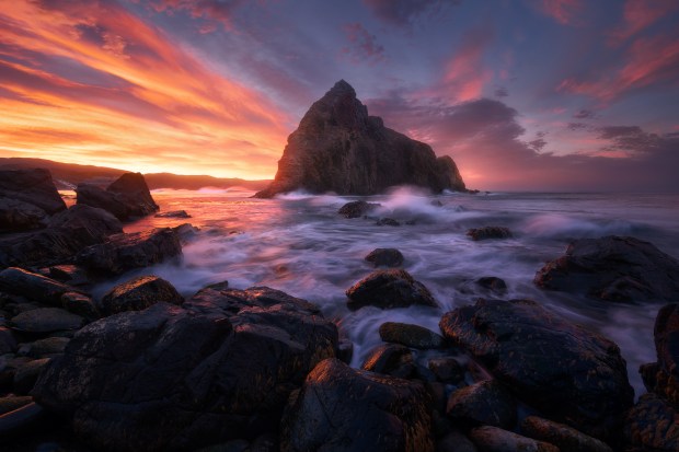 The breathtaking remote location of Lion Rock in Tasmania, a place usually weathered by ferocious storms, revealing its full glory.