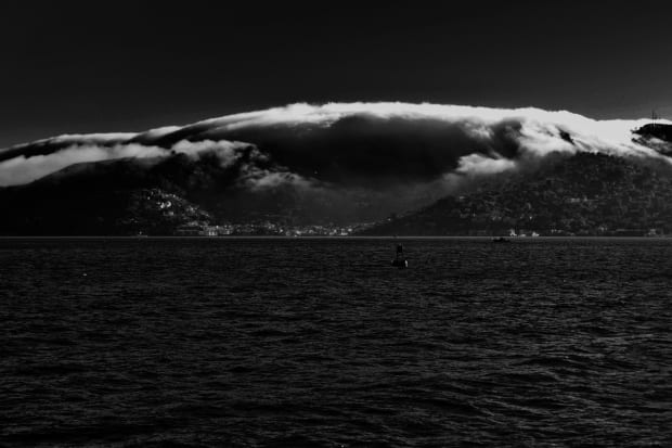 This photograph insights a horror, eery sentiment of clouds crawling over mountains, blurring/whipping out houses, making the viewer ponder the view deeply and thoroughly.