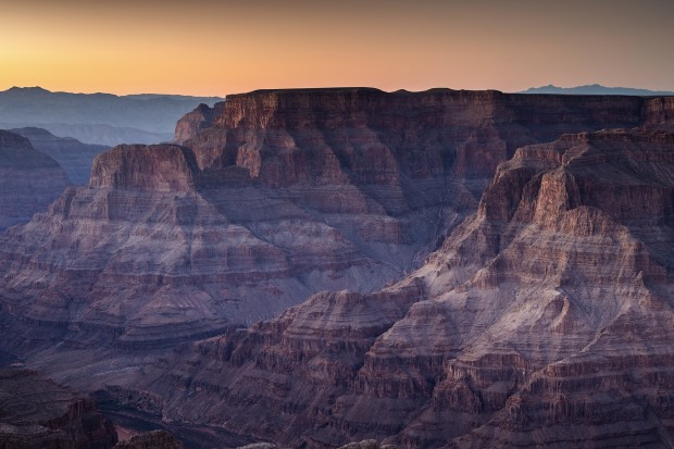 As the sun dips below the horizon, the Grand Canyon reveals its true colors. This shot captures the quiet transition into twilight, where the ancient, rugged limestone and shale are bathed in a soft purple glow, framed by a golden sky that stretches into infinity.