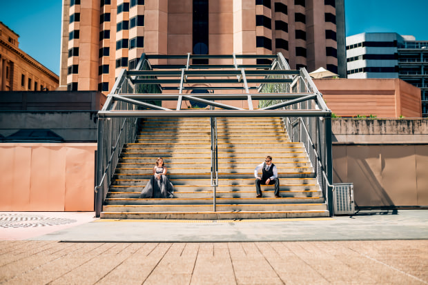 A couple captured on the steps of Adelaide Festival Plaza the morning after their fancy night before.