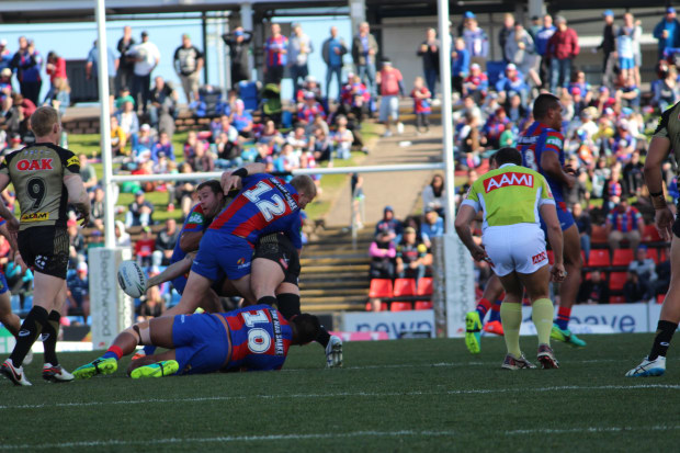 Trent Merrin offloading in the Panthers V Knights game.