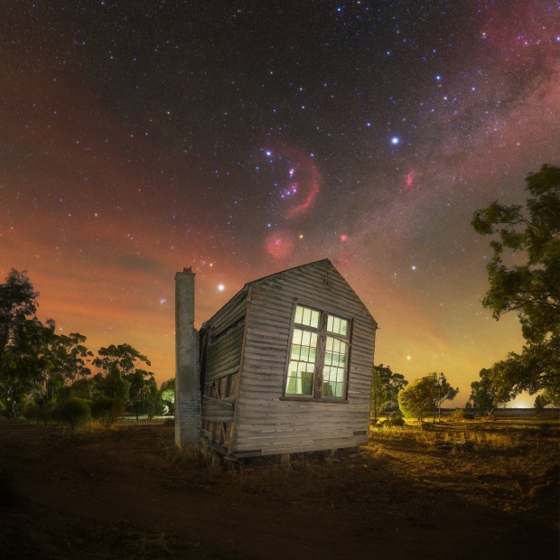 Once an old school building in country Victoria, this now derelict building sits beneath the rising summer milkyway arch with the Orion constellation pictured overhead, the scene is backlit by a nearby bonfire.