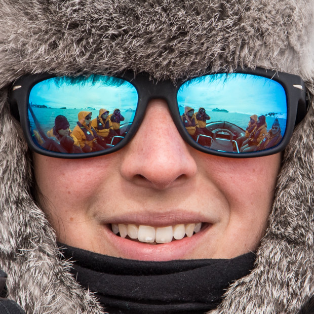 A close look into the guide's eyes reflects the visitors, their ship and the Antarctic.