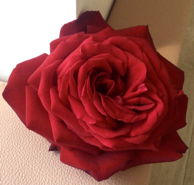 A red rose laid on some seats in the hospital my husband was in recently. On the other end of the long row of seats a homeless man lay. Incongruous. Sad. But somehow that rose offered light and life and care. For my husband too who is far from well.