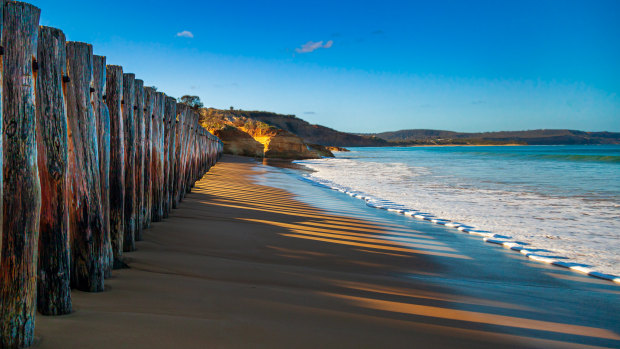 The harsh sun cast shadows through the pole structure sea wall, extending down to the waters edge. the character of the sea wall caught my eye, along with the sun shining through its gaps