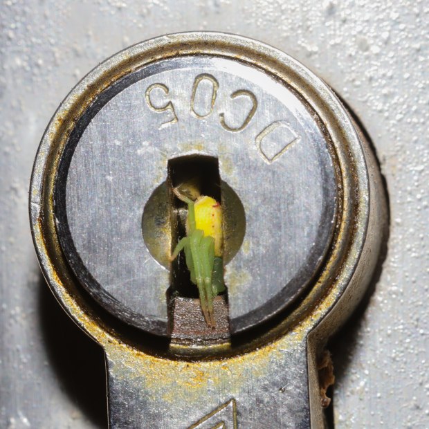 A colourful crab spider hides in a door keyhole