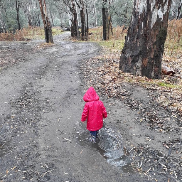 My 2 year old daughter walking through the aussie bush whilst its dark, cloudy and raining