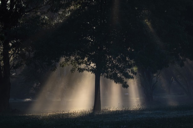 The early morning sun light combined with the fog coming through this tree's branches and leaves made for a spectacular sight, reminding me of when someone switches on a lamp.