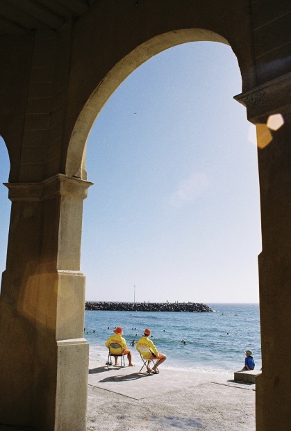 Seeking some solace in the shade on Cottesloe Beach, I was struck by the multiple perspectives in this scene. The little child gazing admirably at the two heroes, hoping that he might wear the yellow and red one day. The two lifeguards anxiously keeping watch over the oblivious throngs of summer swimmers; and me, watching The Watchers.