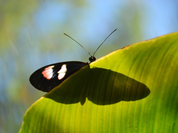 A butterfly’s wings cast shadows in the light from the shelter of a leaf