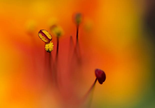 A close-up of the stamen and anther of a tropical flower