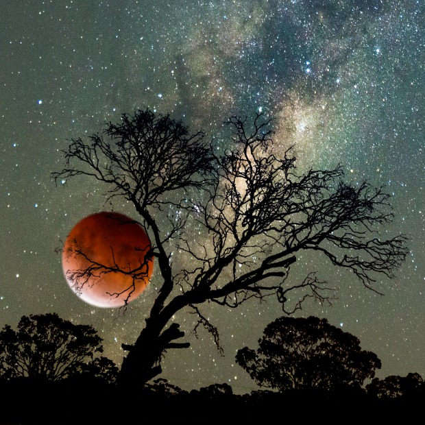 A composite image merged from 3 elements: the round blood moon, the Milky Way, and the trees from local parish.