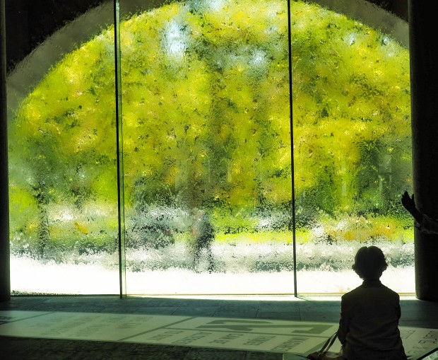 A gallery visitor sits at the entrance to the Victorian Gallery of Art. Outside the trees seen through the glass entry.