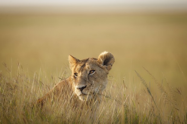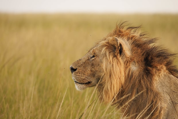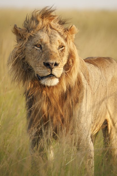 Lion Pride in the late afternoon golden light emerge from the golden grass previously completely camouflaged. Taken in Maasai Mara Kenya Africa