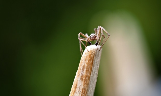 Hand held macro of a little spider on a wooden clothes peg.