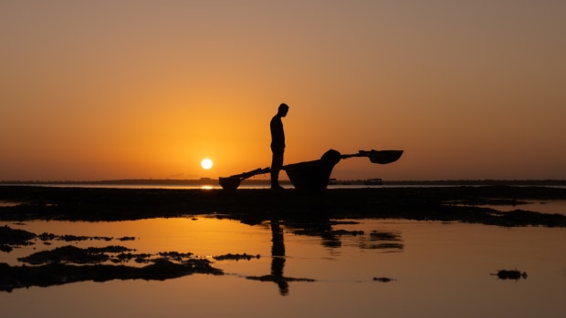 I took this as the sun was setting while I walked along a remote beach in a fishing village on the west coast of Zanzibar Tanzania. It was not set up, I simply took these shots of this young man as he was approaching his boat. I continued shooting until the sun went down, changing my position to get a deeper reflection in the water. I did go over afterwards and showed him the images. He was very pleased.