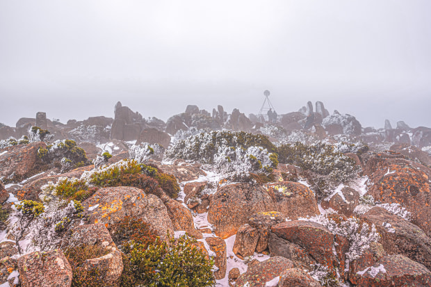 A couple stand beside the highest point of Mount Wellington and share a touching hug.