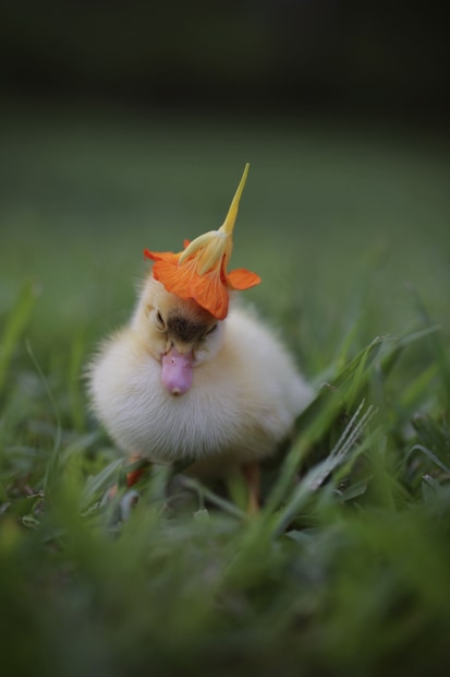 One of our baby ducks egg with a flower top hat on