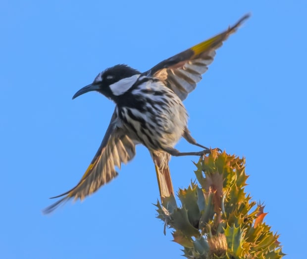 A White-cheeked Honeyeater looking very balletic.