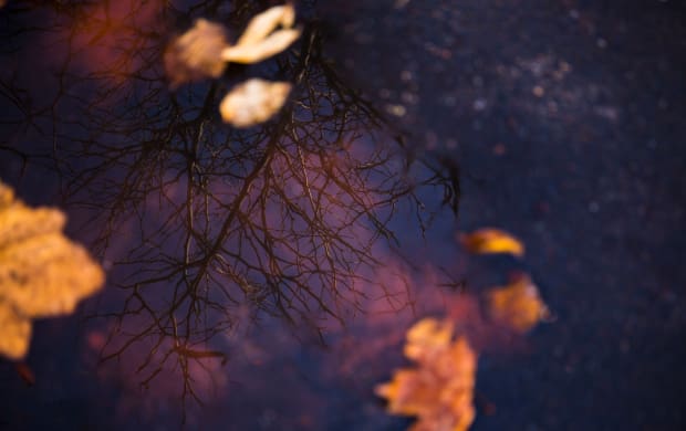 A dreary skeleton of a tree amongst leaves in a puddle.