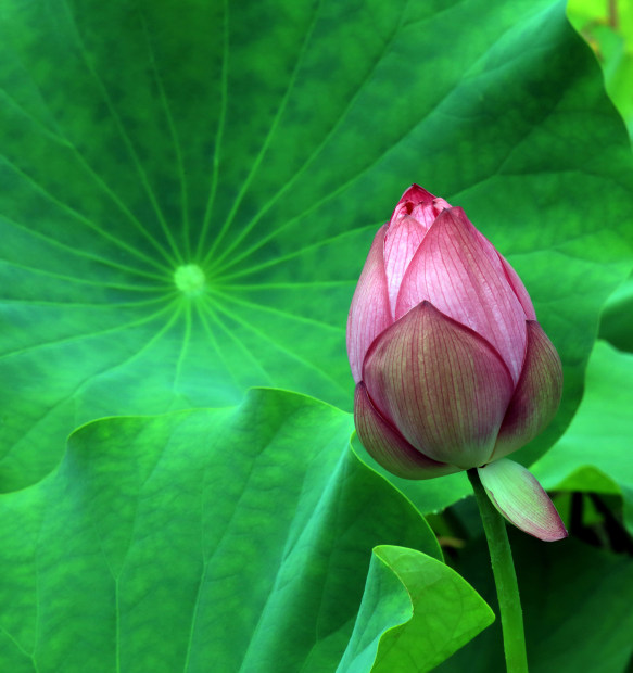 A beautiful composition of a red-pink flower and juicy green leaves with simple lines leading to the center. The photograph was taken in a botanical garden in South Korea.