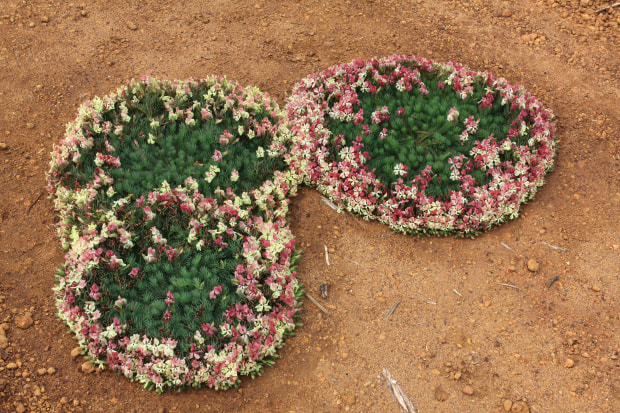 An incredible composition of flowers shaped into wreaths. A magnificent, almost annual creation of nature on the gravel verge of an asphalt road near the town of Mullewa in Western Australia.