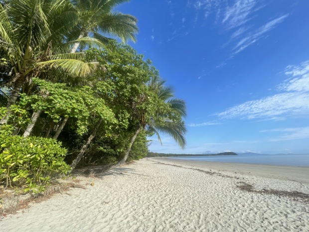 Crisp white sand matched with turquoise clear water at Four Mile Beach, Port Douglas QLD Australia.